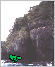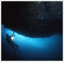 錦ヶ浦の絶壁が続く海岸線には、至る所に溶岩活動活動と波の浸食でできた大きな洞窟があります。 「小曽我洞窟」は陸上部分で逆V字に切れ込んだ入口をのぞかせ、スポットにはブイが打っていないので、船をアンカリングしてアンカーロープを伝って潜降して、アンカー付近に集合します。