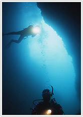 入口は水深9mほどで、5mの幅があります。洞窟は中に進むに連れて狭くなってきますが、洞窟に入ったら入口を振り返ってみてください。 トンネル内に差し込む太陽が、なんともいえずきれいな光を(^^)/~~~降りそそいでいます。