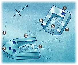 船首、船尾部分ともに船の中央部は船倉になっています。船を安定させるために後で入れたゴロタ石がいまでは岩のあいだに砂がたまり ヒラメの姿も確認できます。