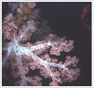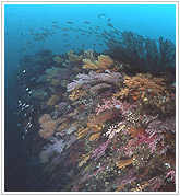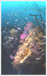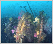 船が2つに折れた裂け目部分。むき出しになった鉄筋はソフトコーラルがつきウミトサカをはじめ、いろいろな動物が付着している。 魚の群れも集まりやすくネンブツダイの大群が常にここで見られる。 初心者やエアのもちが悪い人は船尾部分には行かれず、ここで折り返すのが無難(>o<)かな?