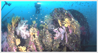 船の側面に沿って後方へ向かうと、船首同様船の側面は垂直に海底まで落ちていて、自然の岩盤のドロップオフのような状態になっています。 水深は、デッキの部分で20mほど、海底で30m前後。船首同様ヤギなどがびっしりと茂っています。